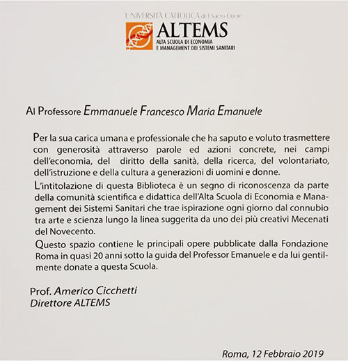 Intitolazione della Biblioteca dell’ALTEMS, Alta Scuola di Economia e Management dei Sistemi Sanitari, dell’Università Cattolica del Sacro Cuore.