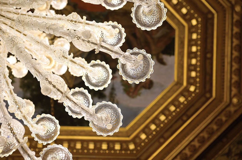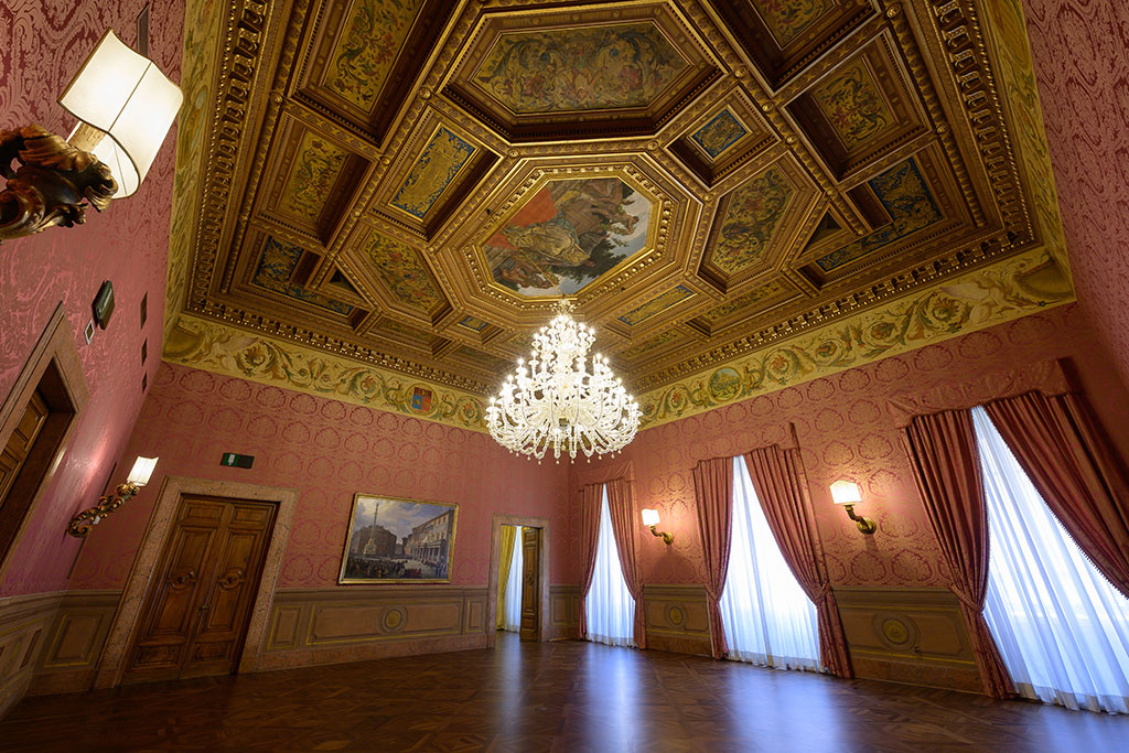 Un ambiente dal fascino regale, dominato da un imponente soffitto ligneo a cassettoni in stile neorinascimentale, secondo il gusto ottocentesco, con decorazioni classiche e l’Allegoria della Pace di Domenico Bruschi al centro.